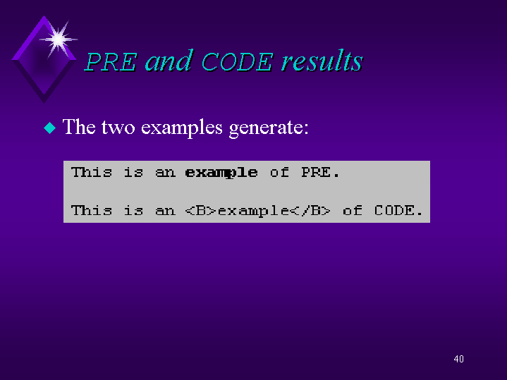 Show both PRE and CODE and note that CODE shows the <B> tag but not boldface on the word EXAMPLE.